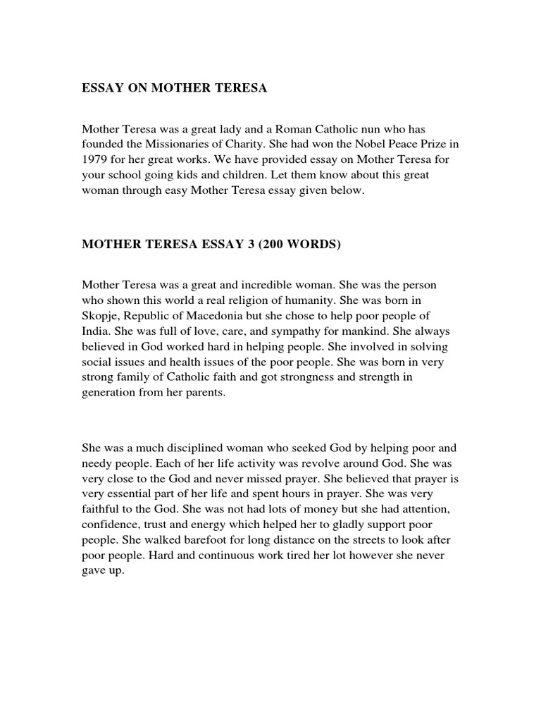 In his Memoire sur les hôpitaux [Memoir on Hospitals], he suggested closing down the thousand-year old municipal hospital of the city of Paris, essay mother theresa, the Hôtel-Dieuand replacing it with a secular, locally-based, essay mother theresa, municipal health-delivery system composed of small neighborhood hospices. He was also not averse to changing his earlier formulated positions. Infor example, he reversed his argument put forward in against progressive taxation, in favor of the same see Greenbaum and Perkins Most significant, however, essay mother theresa, were the evolution of his political views, from support of a reformed, constitutional monarchy to defense of a democratic republic, essay mother theresa, from defense of a property-based franchise to universal suffrage.